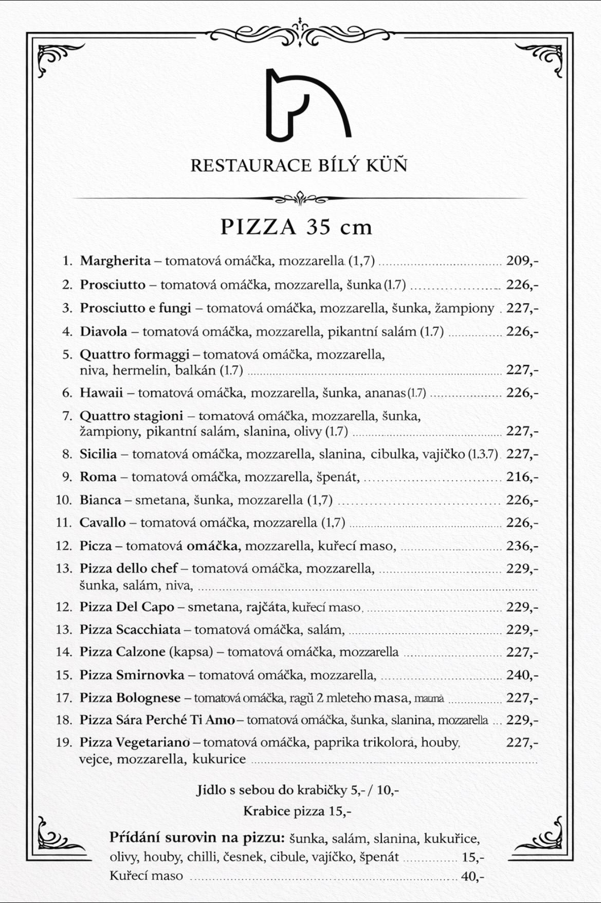 Vedle penzionu se nachází restaurace Bilý Kůň, kam můžete zajít na oběd, večeři či výbornou pizzu z pece.
